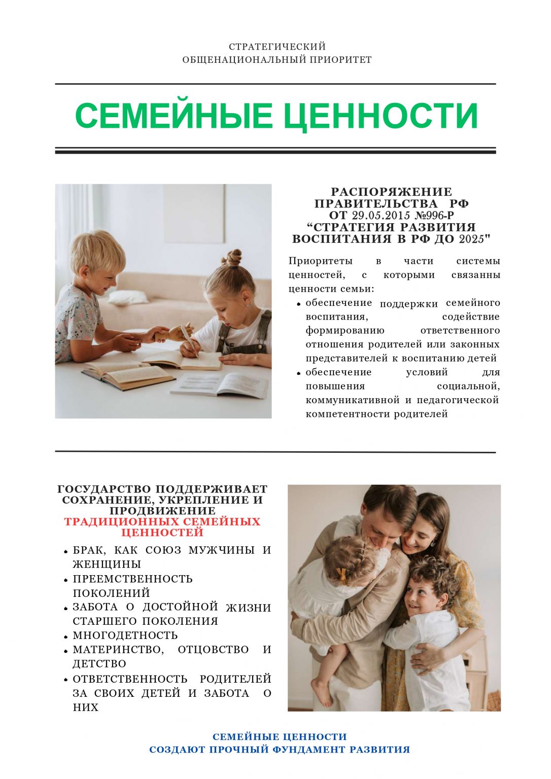 Указом Президента Российской Федерации от 22.11.2023 N 875 2024 год объявлен Годом семьи. Семья является источником любви, понимания и поддержки, учит детей быть добрыми, честными и справедливыми.В Год семьи особое внимание уделено сохранению традиционных семейных ценностей. К ним относятся любовь, верность, уважение, взаимопонимание и поддержка. Эти ценности являются основой крепкой и счастливой семьи. Объявление 2024 года Годом семьи — это важное событие для нашей страны. Это еще один шаг на пути к укреплению семейных ценностей. Крепкая семья — это залог стабильности и процветания общества