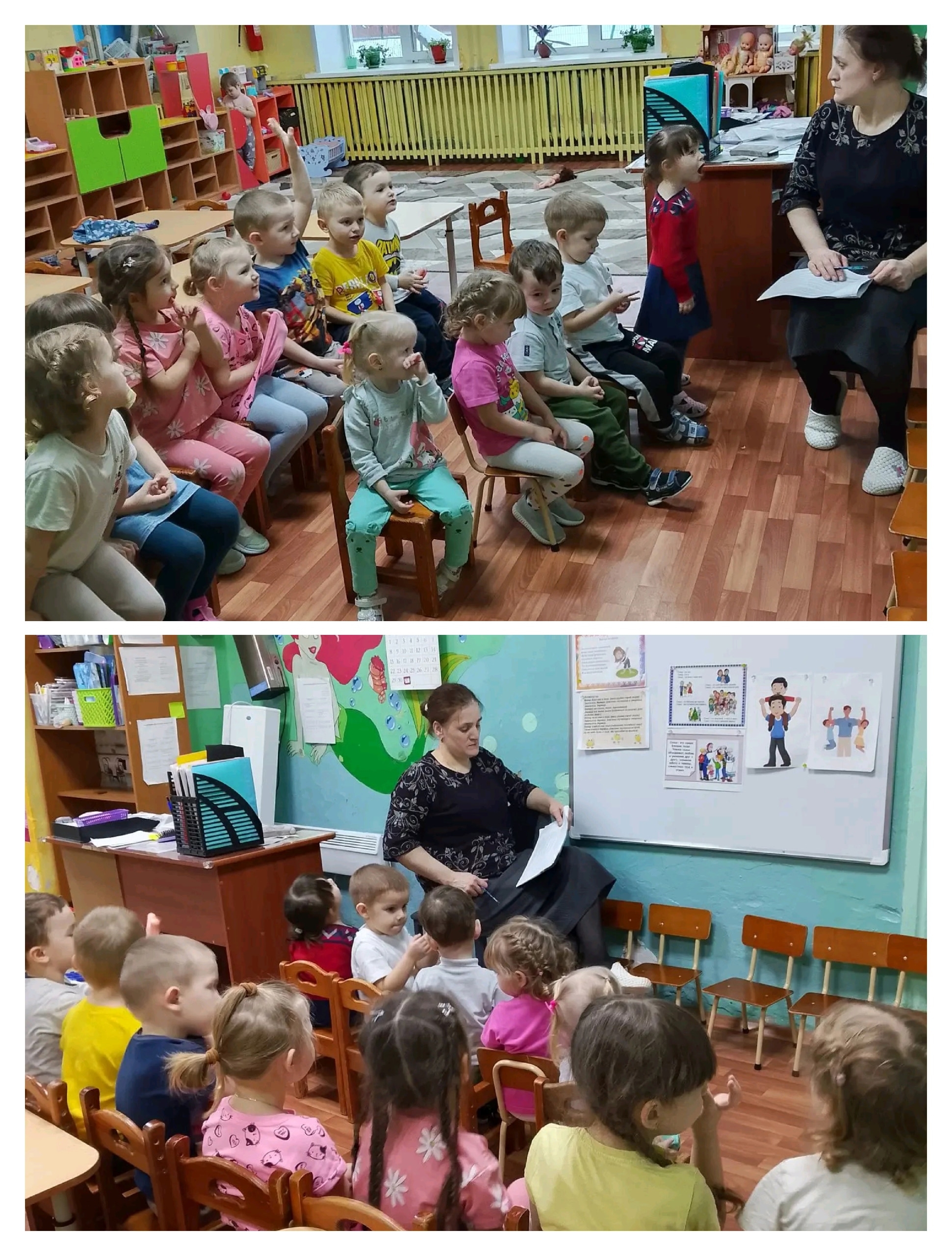 Воспитатели продолжали беседовать с дошкольниками на тему «Семья», целью бесед было формирование у воспитанников представлений о семье и ее членах, их обязанностях и взаимоотношениях. Так с воспитанниками младшей группы состоялась беседа «Я люблю играть с мамой и папой», с воспитанниками старшей группы - «Куда мы отправляемся вместе?».