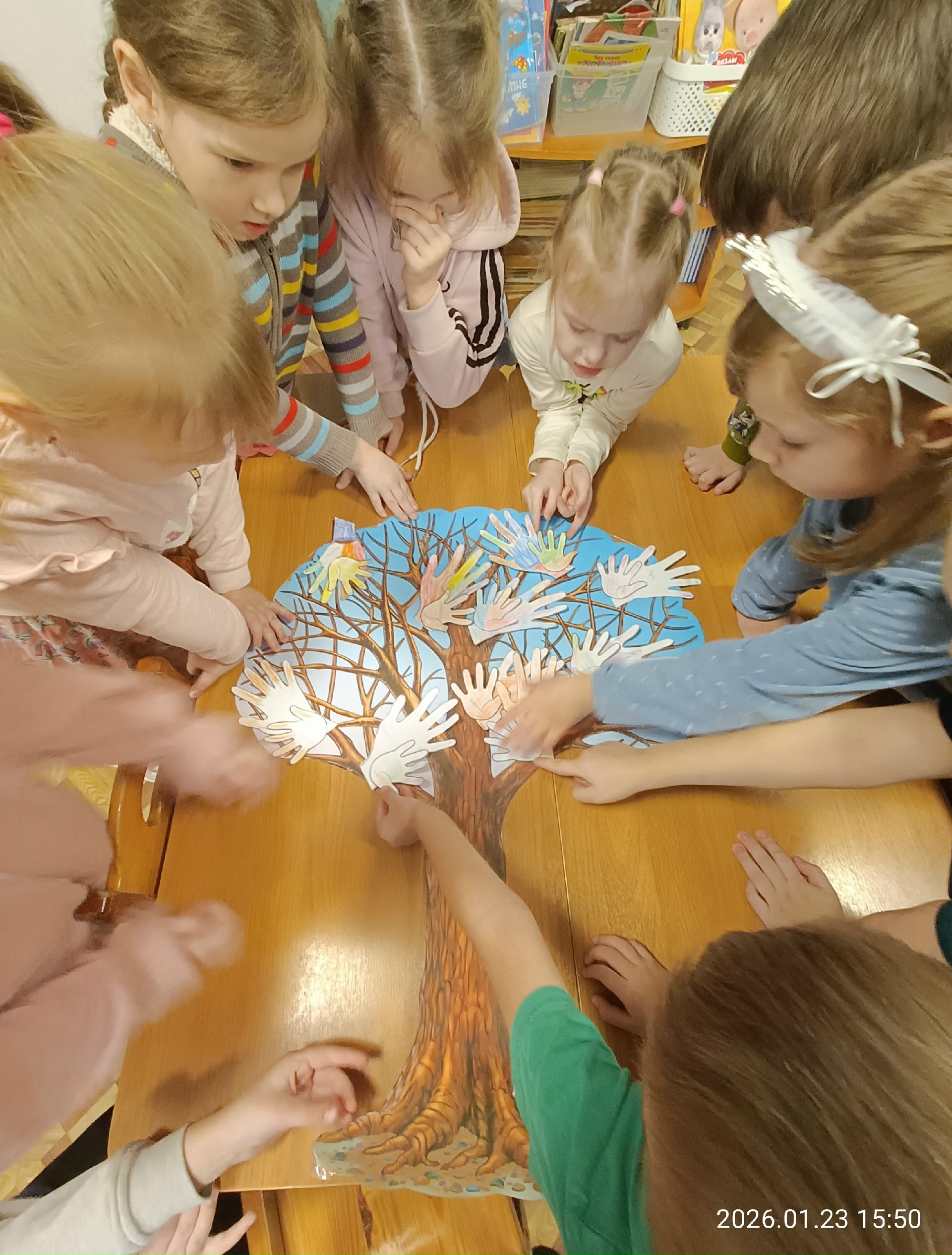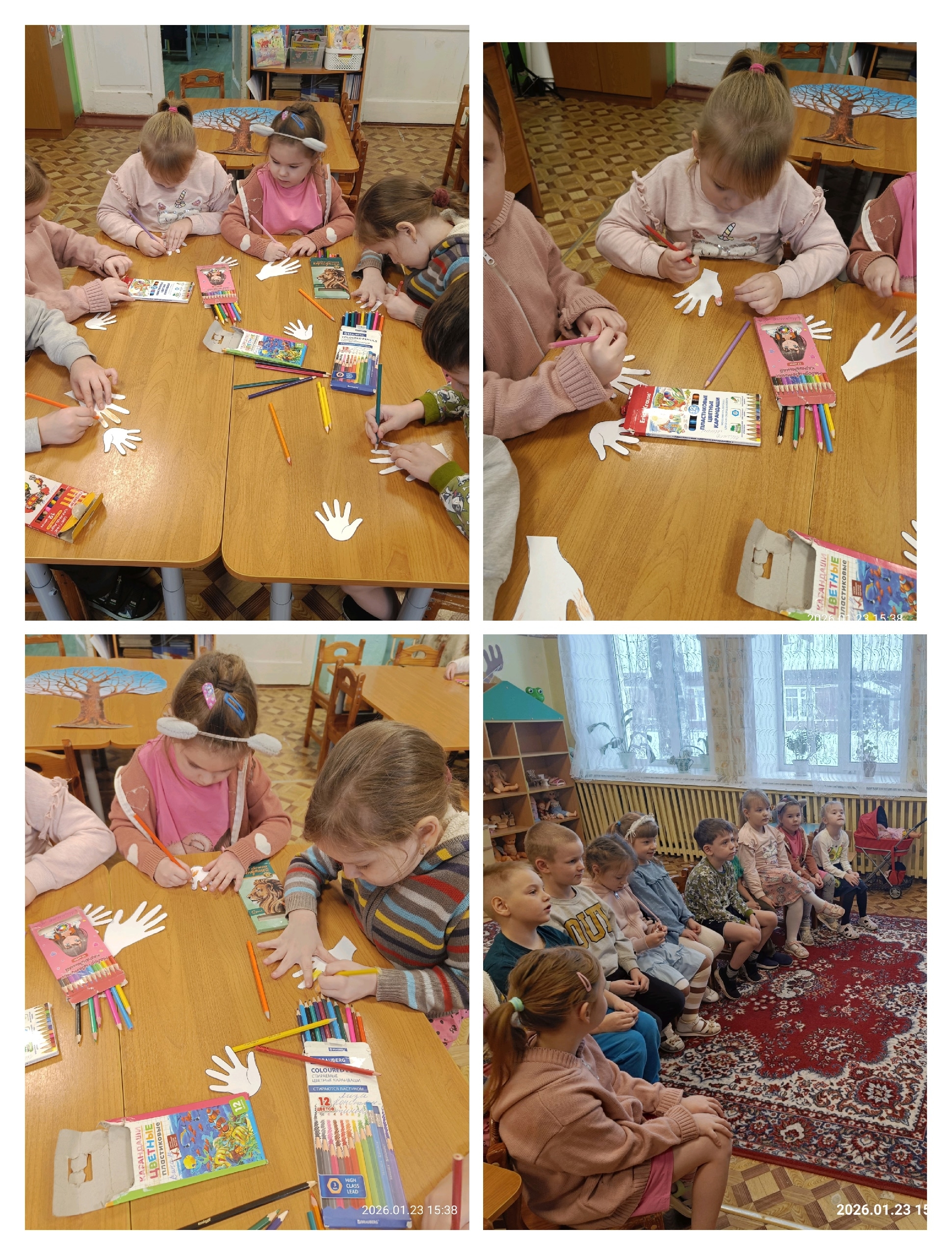 На этой неделе тема занятия по программе Добрый мир была: "Мама, папа, ты и я - вместе дружная семья! ", задачей которого было развитие представления детей о семье как о людях, живущих вместе, любящих друг друга, заботящихся друг о друге. В конце занятия дети, очень стараясь, нарисовали свою семью и оформили коллективную работу " Когда семья вместе, так и душа на месте"