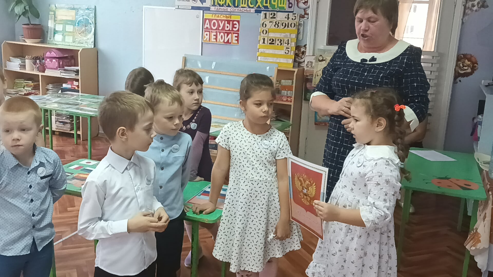 Воспитатель Иванова О.П. показала совместную деятельность по развитию социальной активности детей подготовительной группы в рамках программы "Орлята-дошколята", где на итоговом мероприятии трека "Орленок-эрудит" дети показали свои знания о Родине - России и о малой родине - поселке Спирово.